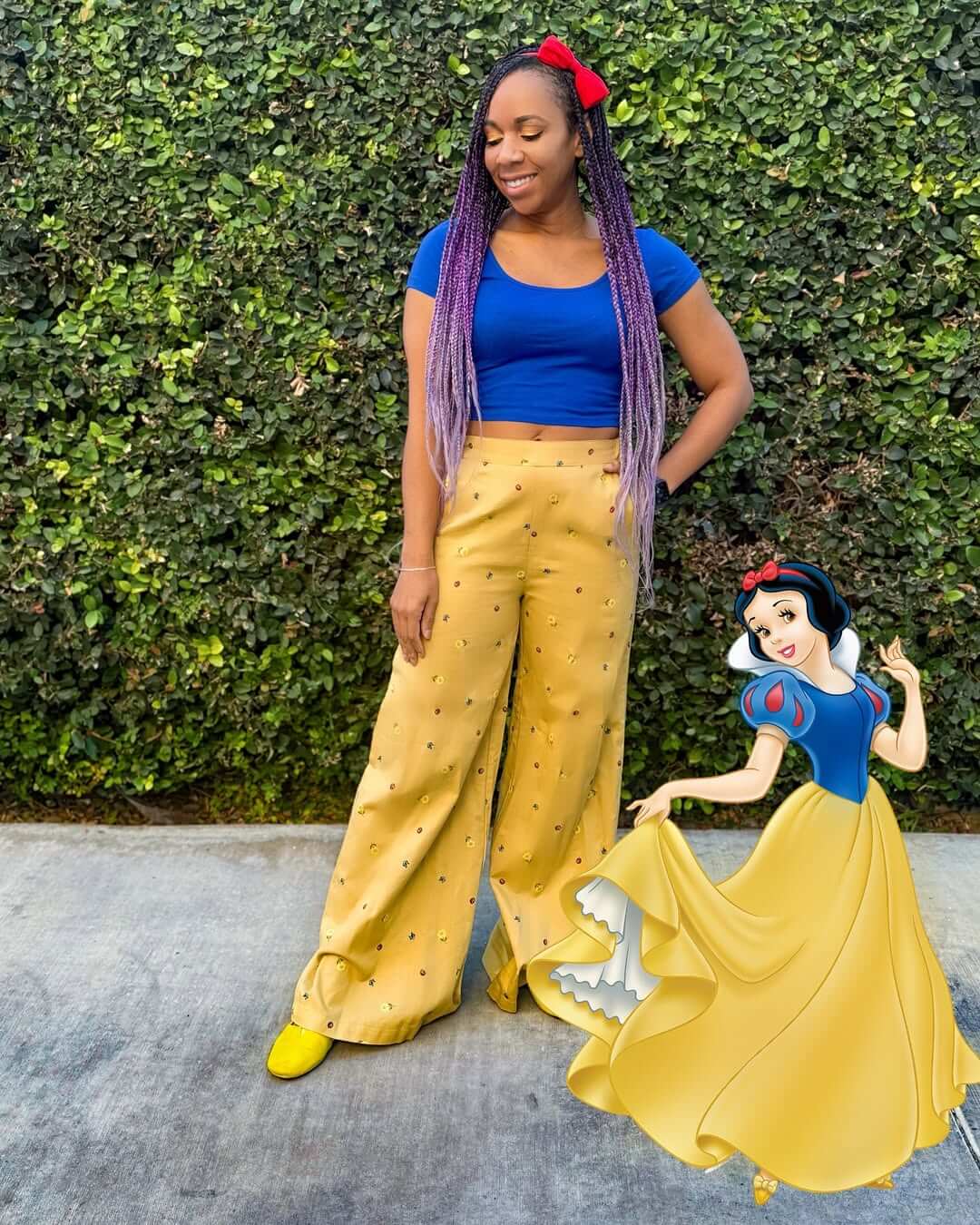 A red bow with a blue skirt instantly says Snow White; a purple top and green pants hint at Ariel’s mermaid spirit.