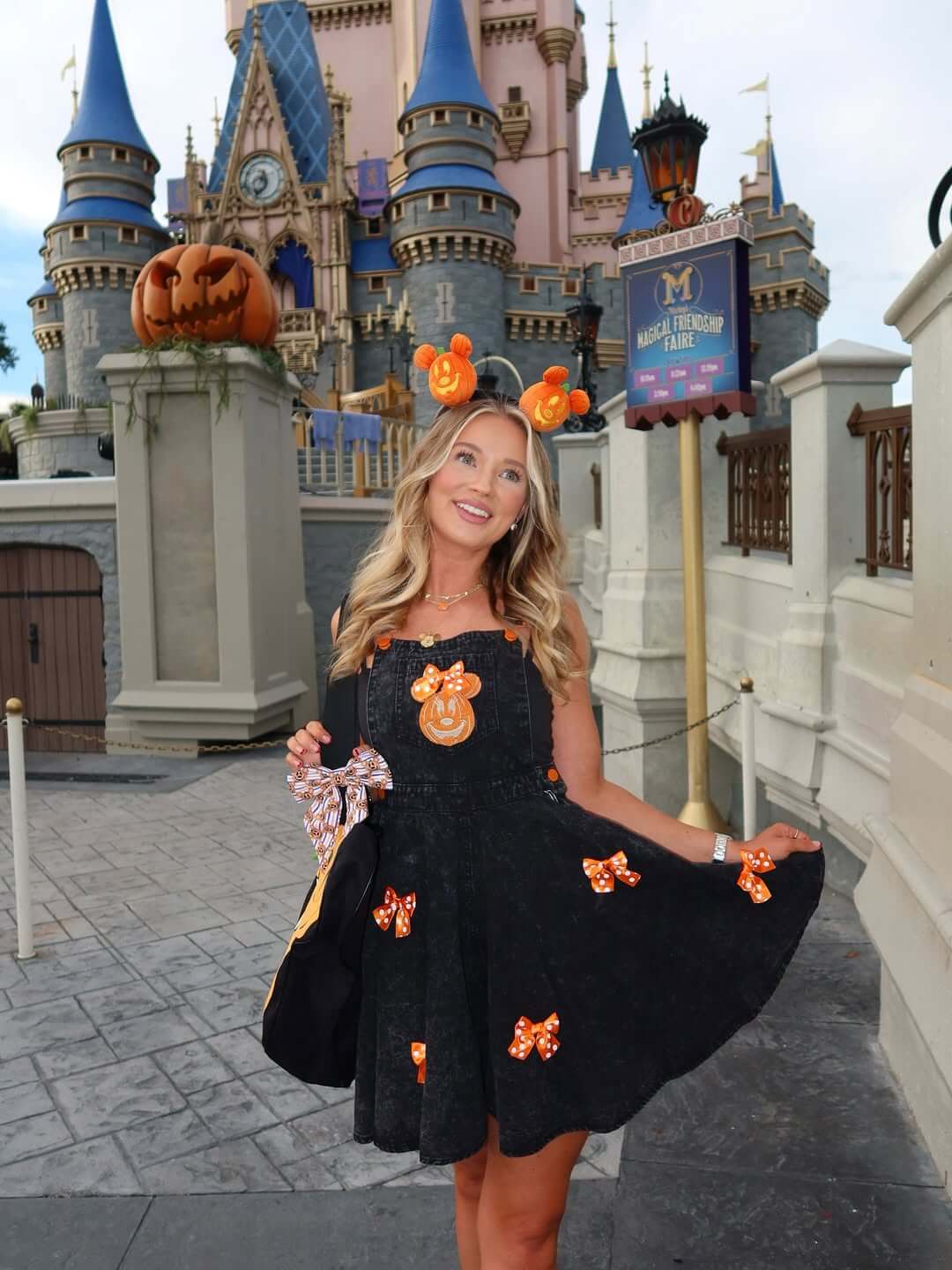 Accessories finish the look. Think pumpkin fanny packs, Haunted Mansion pins, or the classic Minnie ears.