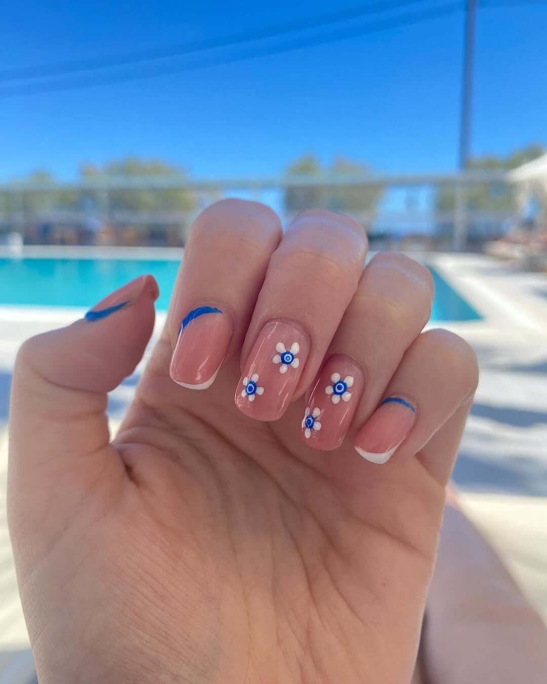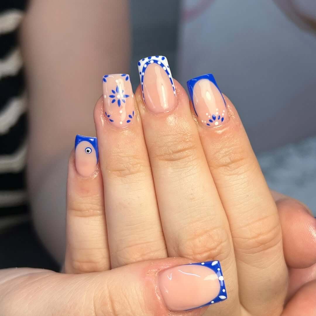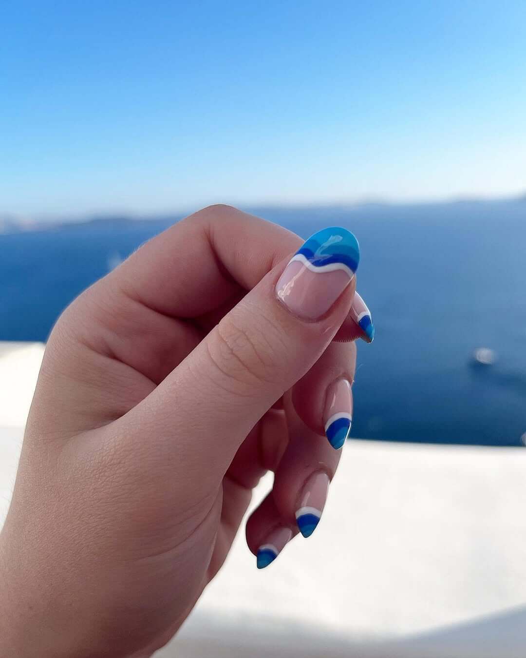 - White dome tips: Paint your nails Santorini blue, then add soft white arcs to mimic those Greek rooftops.