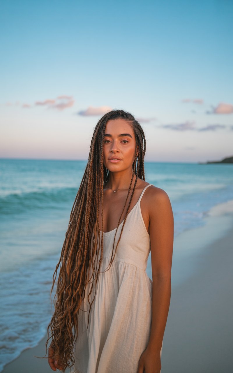 Humidity, salt air, and wind can undo your look in minutes. Loose waves or braids are practical because they look intentional even if they get messy.