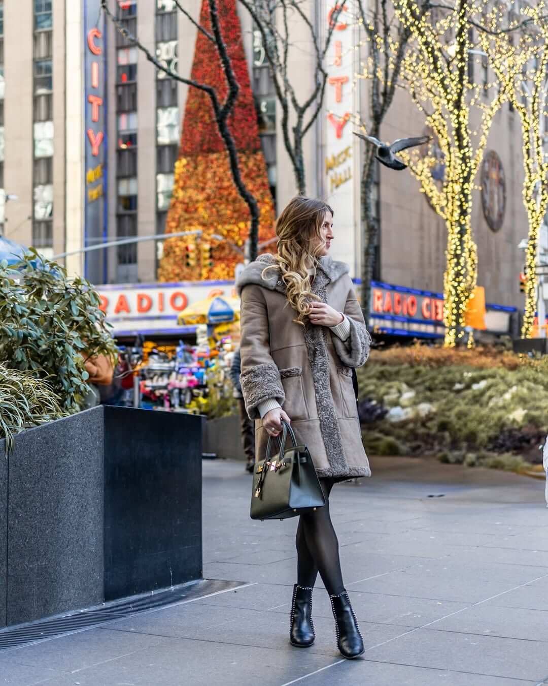 Stick with neutrals like camel, charcoal, and ivory; they look elegant against the city’s Christmas lights.