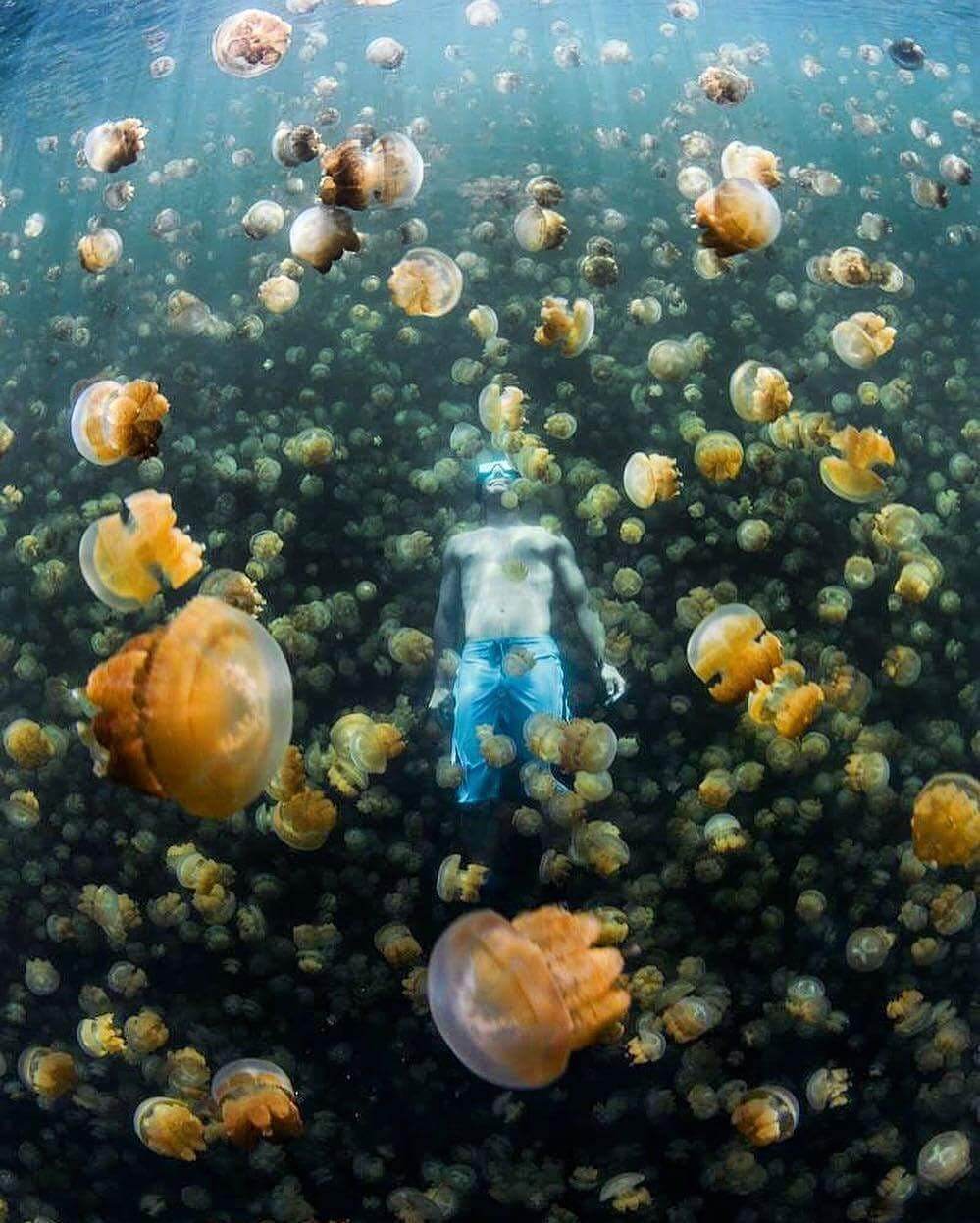 From the Maldives’ gentle giants, let’s head to Palau, where currents and jellyfish turn diving into something surreal.